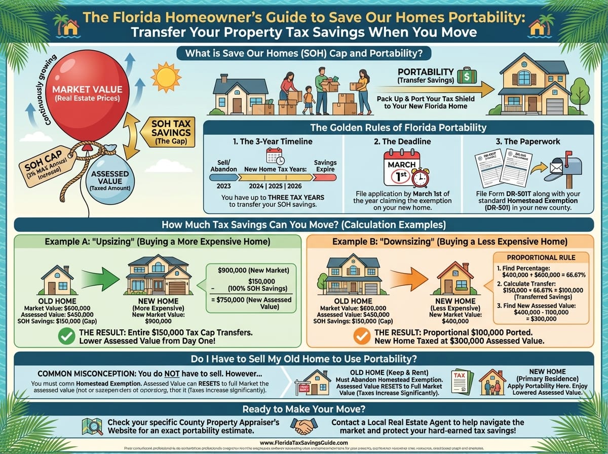 So, what happens if you want to move? In the past, moving meant losing that gap and paying taxes on the full market value of your new house. Enter Portability. Portability is exactly what it sounds like: it allows you to “pack up” your SOH tax savings and port (transfer) them to your new Florida home, lowering the assessed value of your new property from day one.