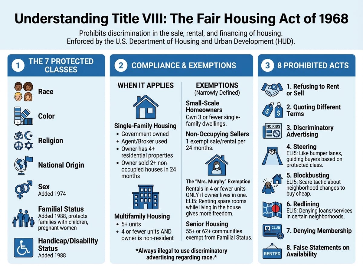 The Civil Rights Act of 1968, commonly referred to as the Fair Housing Act (Title VIII), is a landmark piece of legislation in the United States. It significantly expanded upon the Civil Rights Act of 1964 by strictly prohibiting discrimination in the sale, rental, and financing of housing. Today, this vital law is enforced by the United States Department of Housing and Urban Development (HUD).